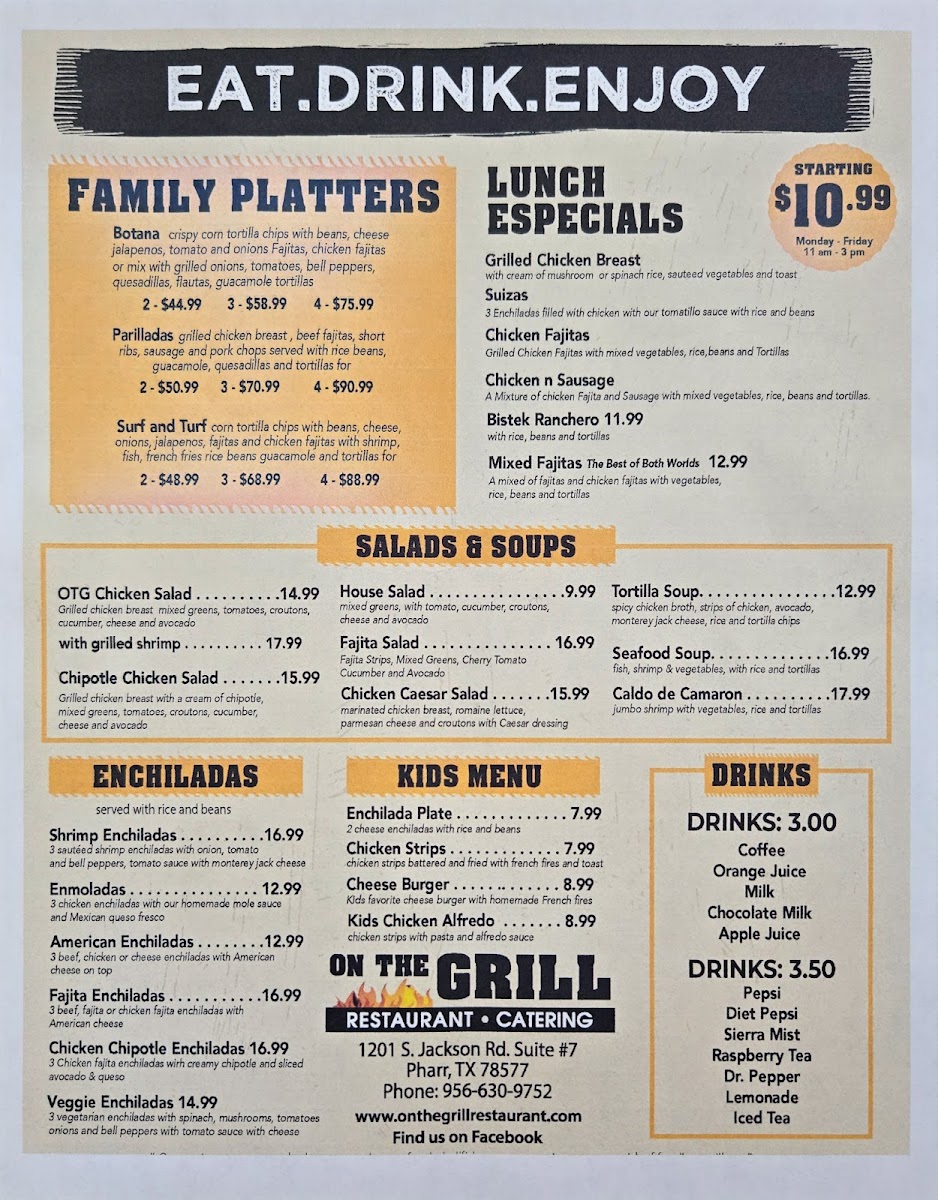 Nestled in Pharr, TX, On The Grill Restaurant offers a vibrant fusion of Mexican-American flavors that is truly enticing. From succulent steaks to delicious ribs, their menu caters to all tastes, ensuring every bite is savored. The freshly made guacamole is a must-try, complementing dishes like fajitas and enchiladas, celebrated for their authentic taste.
